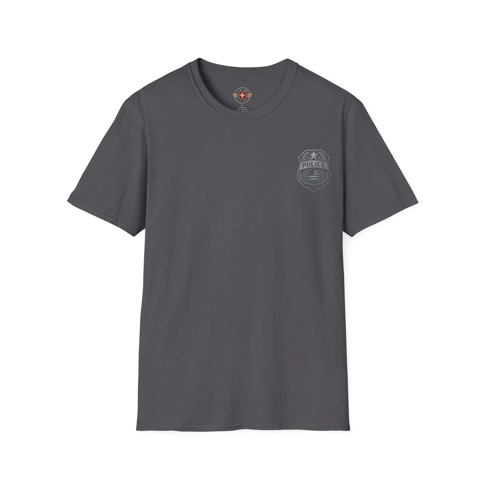 ๐ Primary image shown on backside of shirt, Police logo on front left